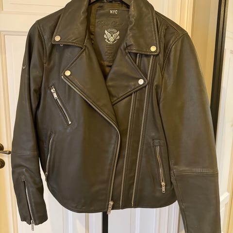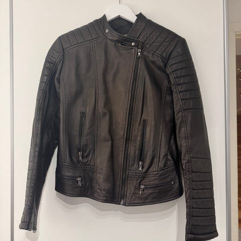 Superdry skinnjakke i svart farge, størrelse S for dame. Jakken er laget av skinn og har glidelåslommer og glidelåsdetaljer på ermene. Den har også belter bak for justering.
