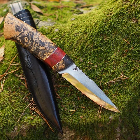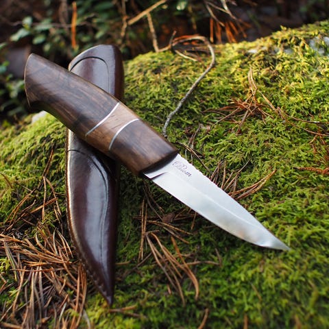 Ny håndlaget bruks-kniv til salgs (ref. 264) Knivbladet, som er 100 mm langt, er trelags laminert, med en kjerne av høykarbon eggstål fra Farmen-smia ved knivsmed Tom E. Myrbråten. Skaftet er laget av valnøtt med frontholk av vannbøffelhorn og med ilegg av vulkanfiber og nysølv. Slira er sydd av masurlær og er farget cognac.