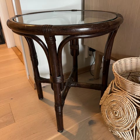 Selger unna pent brukte manila/bambusmøbler. 2 bord med magasinholdere, 1 etasjebord og 1 lampe med potteholder. Lampeledningen er kuttet, men det burde være relavtivt uproblematisk å ordne dette for den som kan det.