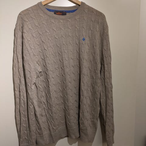 Morris genser i størrelse XL, laget av merinoull. Genseren har en høy hals med glidelås og er designet for menn. Materialet gir god isolasjon og komfort.