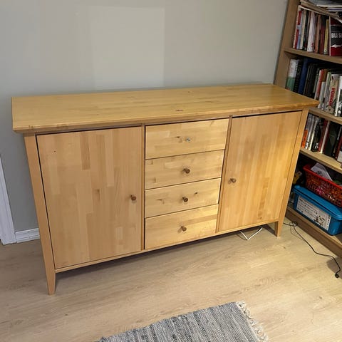 Skjenk i tre med flere skapdører og skuffer. Skapene har hyller for oppbevaring, og skuffene gir ekstra lagringsplass. Passer til oppbevaring av ulike gjenstander i stue eller spisestue.