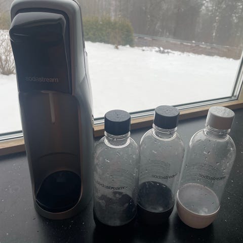Denne modellen bruker blå kullsyrepatron som kan kjøpes hos butikker som Clas Ohlson eller Jernia.
