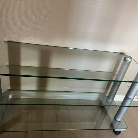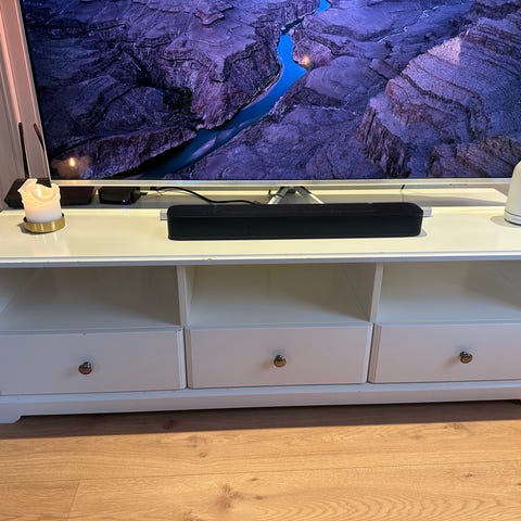Jeg har et TV-benk til salgs i veldig god stand. Det er bare to små hull på forsiden, som er synlige på det siste bildet. Ellers er det i perfekt stand. Det har en hylle og to skuffer.