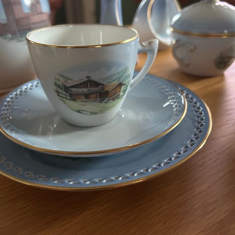 Meget pent/ nesten ikke brukt, litt "skav" på gullet på noen kanter/ 8 kopper med skål, kaffekanne, fløtemugge og sukkerskål.