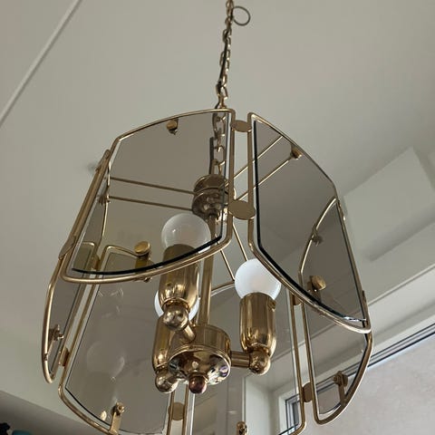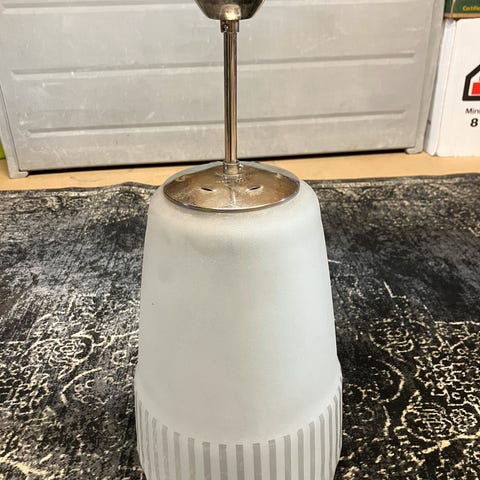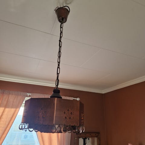 Innvendig er lampen hvit, og gir derfor godt lys. Kan eventuelt sette på dimmer, avhenging av bruksområde. Utvendig er den kobberbelagt, og kobber gir en fin, varm glød. Den ytterste skjermen har fått to riper (se bilder). Det vil sannsynligvis ikke bli synlig når den henger i taket.
