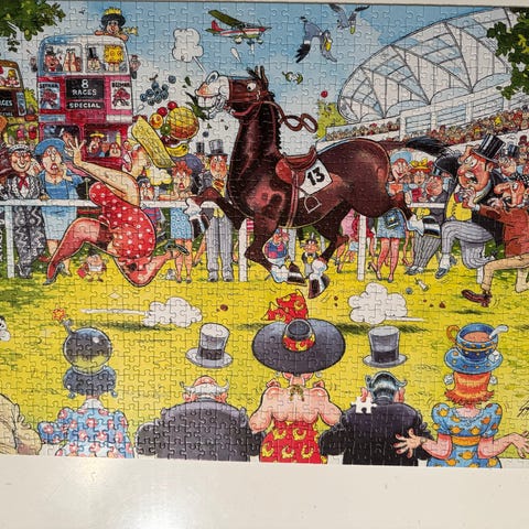 Jumbo Wasgij 7 Destiny Puzzle Retro med 1000 brikker. Puslespillet har et retro-tema med en illustrasjon som viser en scene med motorsykler og mennesker i en livlig gate.