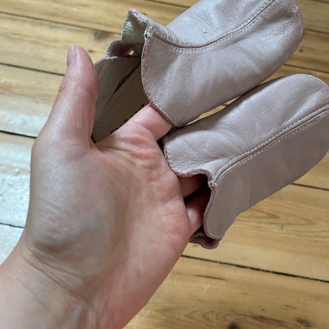 Fint brukte tøfler i skinn, sømmen på den ene er gått langt litt opp, se bilde, men en merker ikke noe på innsiden.