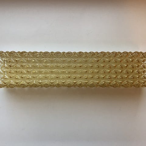 Firkantet blankt «glassrør» beregnet på å sitte i en plast el. metallramme med en lyskilde i hver ende, så det blir en horisontal vegglampe. Glatt på den ene langsiden, rutete på de andre sidene, noen merker inni glasset som vist. Glasset er 29 cm langt pluss 1/2 cm kant i hver ende, ca 6 cm høyt. Sannsynligvis produsert av svenske Orrefors på 60/70-tallet.