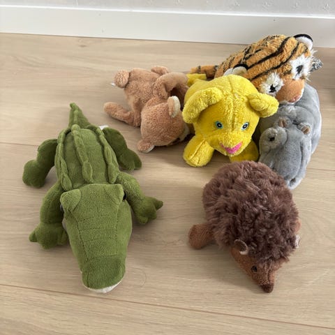 Min datter selger en samling med ulike leker, blant annet kosedyr, småspill, bøker og leketilbehør, slik som vist på bildene.