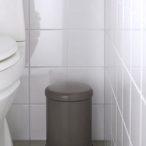 Lite søppelspann som lukker seg forsiktig og lydløst, har et håndtak på baksiden.