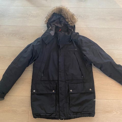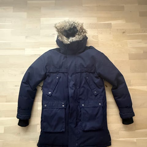 Didriksons vinterjakke i blå farge, størrelse M. Jakken er designet for menn og egner seg til utendørs bruk i vinterforhold. Den har flere lommer og en hette med avtagbar pelskant for ekstra beskyttelse mot vær og vind. Jakken har isolerende fôr og pustende materiale for komfort i kaldt vær.