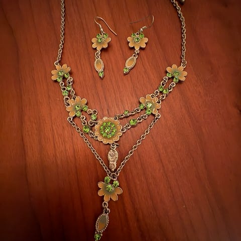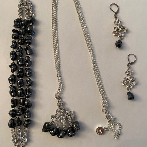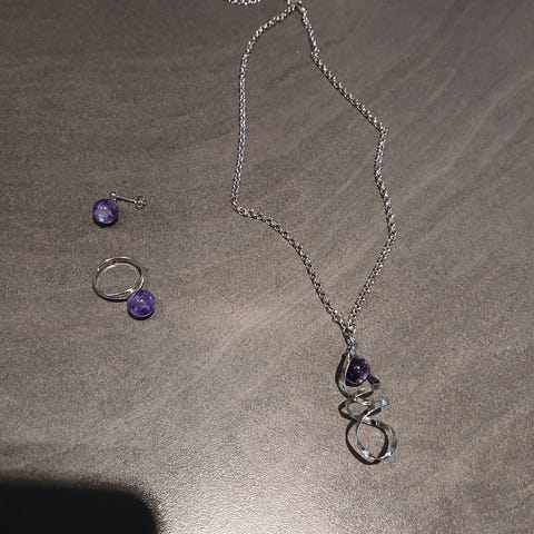 Består av langt kjede med anheng og lekre øredobber