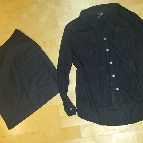 Alle klærne er hele og pene. Mest gensere, et par jeans, bluser og t-skjorter, en kjole.