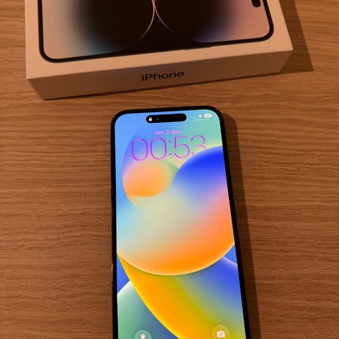 Selger en pent brukt iPhone 14 Pro Max i fargen Deep purple med 128 GB lagringsplass.