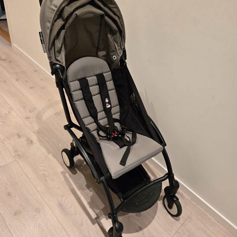 5 punkt sele, og oppbevaring under. Koppholder. Bøyla foran kan tas av. Og fothvila kan justeres. Lett og legge sammen og tar liten plass. Litt bruks slitasje. Se bilder. Selges kr: 500