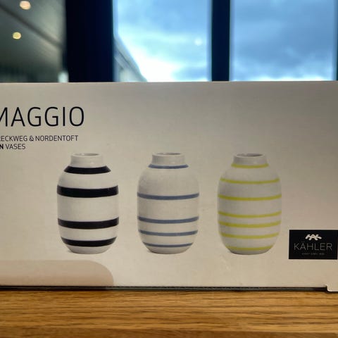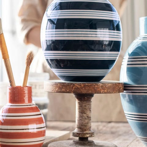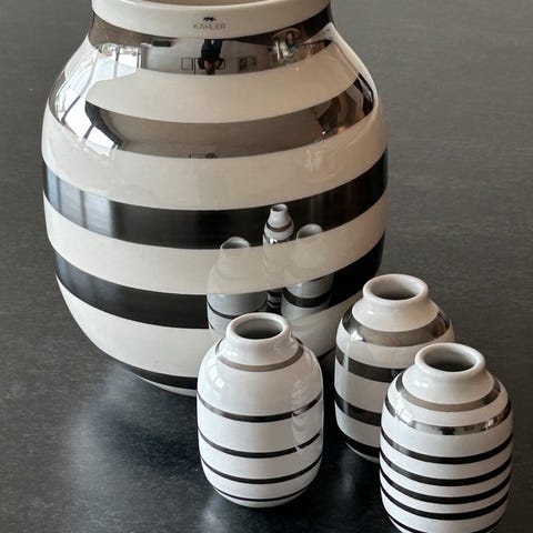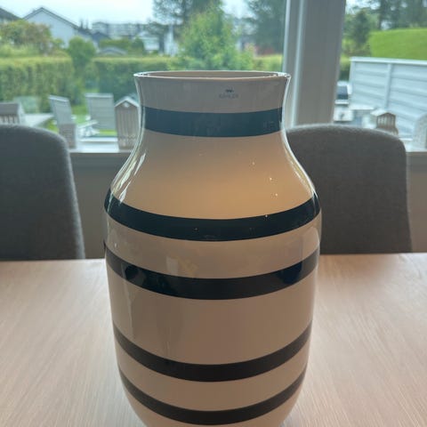 Kähler Omaggio vase designet av Reckweg & Nordentoft. Vasen har et stripete mønster i blått og hvitt, laget i keramikk.