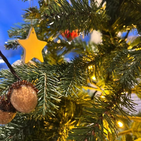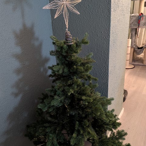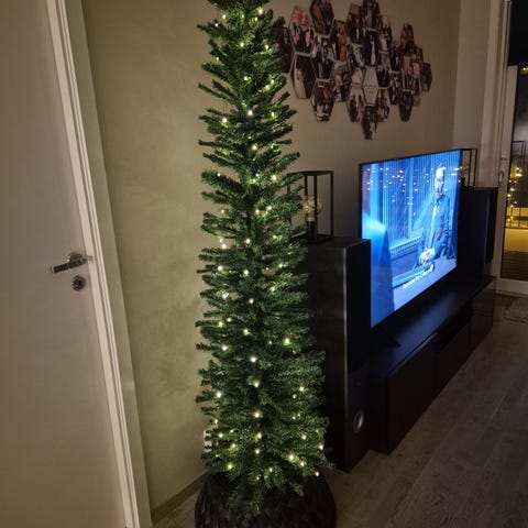 Selger pent brukt juletre. Kjøpt for 3999,- for to år siden. Det er samme tilbud nå, så derfor selges det for redusert pris 2500,- kr. Ingen bruksmerker, ikke vært i et hus med barn. Hunden på bildet har ikke vært borti treet. Kan hentes i Trondheim. Treet er delt i 3 deler. Lys følger med treet. 180cm høyt.