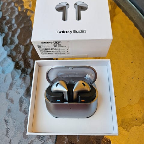 Samsung Galaxy Buds3 er trådløse ørepropper med åpen design, aktiv støydemping (ANC) og Galaxy AI-funksjoner, inkludert sanntidsoversettelse.