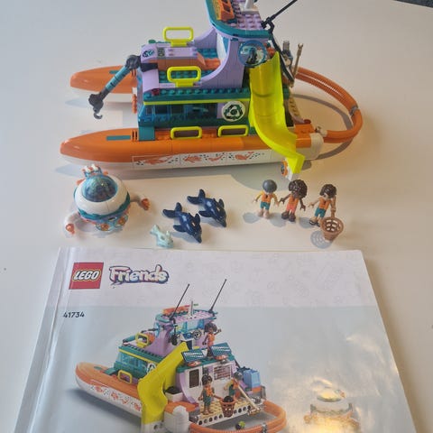 LEGO Friends Redningsbåt LEGO-set med flere minifigurer og tilbehør. Settet inkluderer en detaljert cruiseskipmodell med flere etasjer, små øyer og båter. Passer for barn 7+. Sett har alle elementer.
