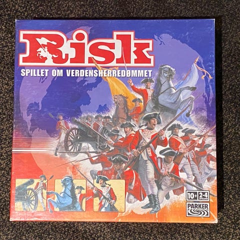 Risk Brettspill med tema verdensherredømme. Tror ikke det har blitt brukt. Passer for 2-6 spillere, anbefalt alder 10 år og oppover. Inneholder spillbrett, terninger, og spillbrikker i flere farger.