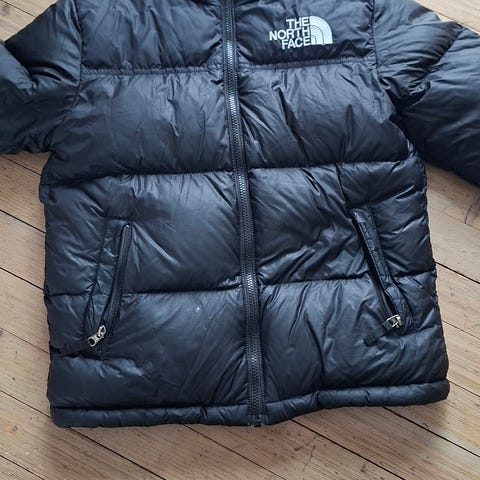 The North Face dunjakke i flerfarget design, størrelse 164, egnet for unisex barn. Jakken er laget av dunmateriale. Kan brukes på begge sider.