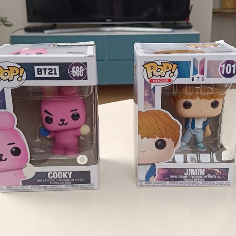 Selger en BTS Funko pop. Esken har vært åpnet og figuren har blitt tatt ut av emballasjen.
