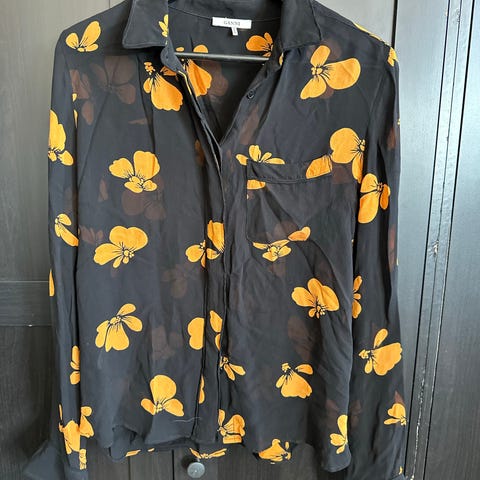 Pent brukt bluse fra Ganni i str M, blomstrete med svart bunn