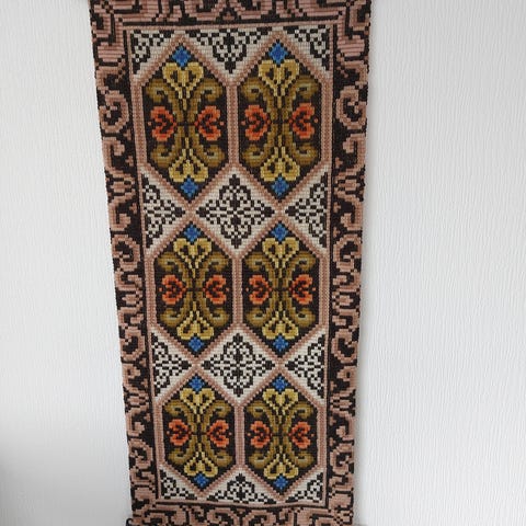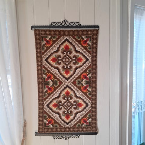 Håndlaget veggteppe med dekorativt mønster i flere farger. Teppe har en metallramme øverst for oppheng. Passer som dekorasjon på vegg.