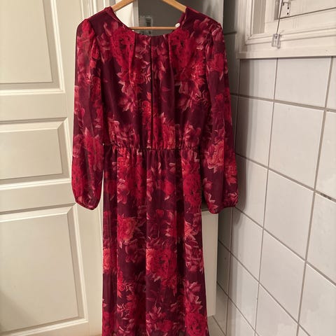 Maxikjole til salg! Brukt kun to ganger Løstsittende maxikjole i vevd stoff med heldekkende mønster laget av metalliske tråder. Volangkrage og V-formet åpning foran. Lange ermer.