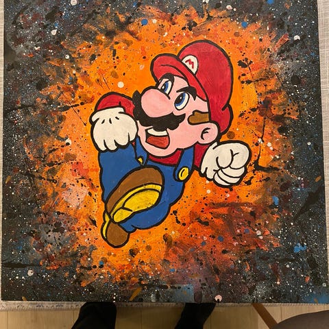 To malerier med motiv av Mario og Luigi fra Super Mario-serien. Hvert maleri viser en karakter i fargerike klær mot en blå himmel bakgrunn. Maleriene er laget på lerret og har et tegneserieaktig uttrykk.