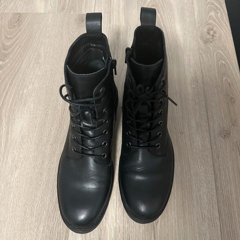 Roots støvler i størrelse 39, svarte i fargen. Støvlene har snøring foran og glidelås på siden. Materialet er blankt og gir et glatt utseende. Egnet for bruk som fottøy i ulike værforhold.