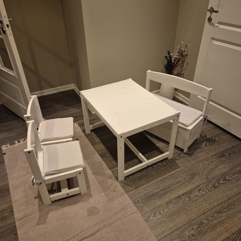 IKEA småstad benk og benk med skuff selges. Pent brukt, og har ingen synlige bruksmerker eller slitasje. Stått på barnerom. Skuffen rommer mye leker, og knotten på skuffen er malt i en dus lilla/rosa.