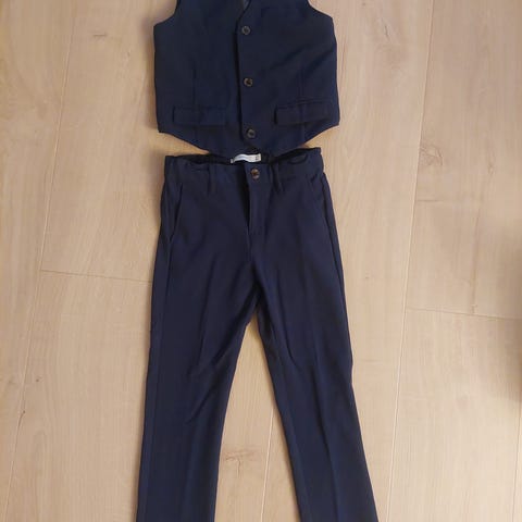Kjøpt nytt av oss. Brukt 3 ganger. Mykt og godt stoff. Merke kappahl (ikke newbie). Fargen er mørkegrå. Buksene er str. 110 og vesten er str. 116.