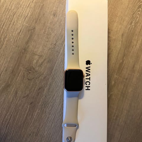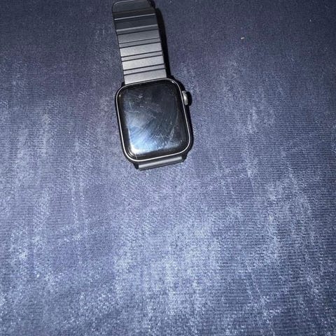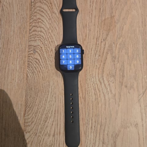 Apple Watch svart smartklokke med svart reim. Kun brukt et par ganger. Enheten har en firkantet skjerm og leveres med ladekabel. Passer til daglig bruk for å holde oversikt over tid, meldinger og helsefunksjoner.