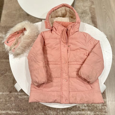 Cubus vinterjakke i størrelse 110 for jente. Jakken er rosa og laget av polyester. Den har hette med avtagbar pelskant og lommer foran. Jakken er designet for barn og egner seg til utendørs bruk.