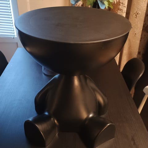 Selger et dekorativt og morsomt sidebord formet som en bjørn i morgenkåpe. Bordplaten holdes over hodet og gir et unikt uttrykk som passer godt som sidebord, nattbord eller pyntebord.