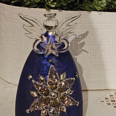 Nydelig engel, glassert, usikker på materiale. 18 cm høy.