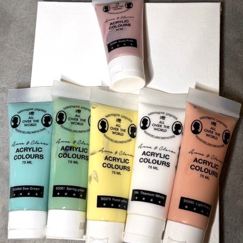5 stk akryl hobbymaling Søstrene Grene. De er åpnet, 2 er knapt brukt, mens 3 er det brukt noe, men over halvparten igjen.