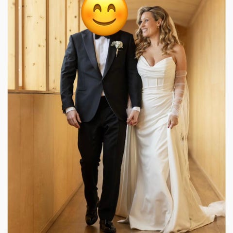 En raffinert og svært detaljert brudekjole i en lett figursydd silhuett. Korsettet har en hjerteformet utringning som elegant fremhever bysten og gir en slankende effekt. Utringningen går sømløst over i brede stropper som faller mykt ned over skuldrene. Ryggen fremheves vakkert av en diskret, lett V-formet utringning. Helhetsinntrykket balanserer perfekt mellom leken sensualitet og tidløs eleganse. Korsettet er dekorert med draperinger i det svært trendy mikado-stoffet, som tilfører kjolen et eksklusivt og edelt preg.