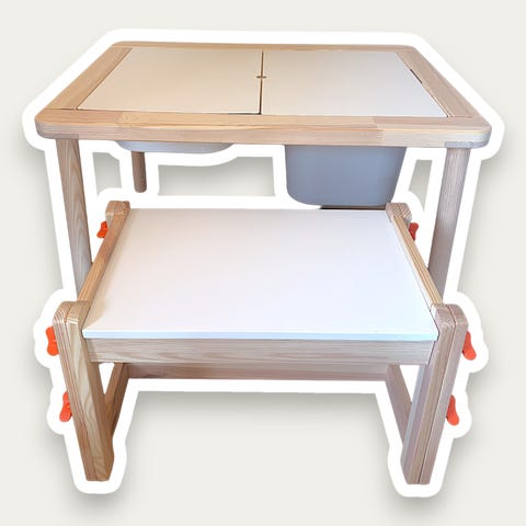 ISkip Hop Explore & More aktivitetsstativ med flere funksjoner. Produktet kan brukes i tre stadier: sitte og leke, kruse og samhandle, samt konverteres til et lekebord. Designet for å støtte barns utvikling gjennom ulike aktiviteter.