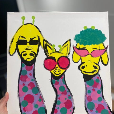 To håndmalte barnebilder med motiver av en sau på gul bakgrunn og en ku på grønn bakgrunn. Bildene er kvadratiske og har enkle, fargerike tegninger som passer til barnerom.
