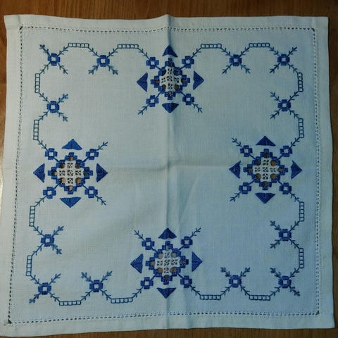 Vakker håndbrodert duk i Hardangersøm.
