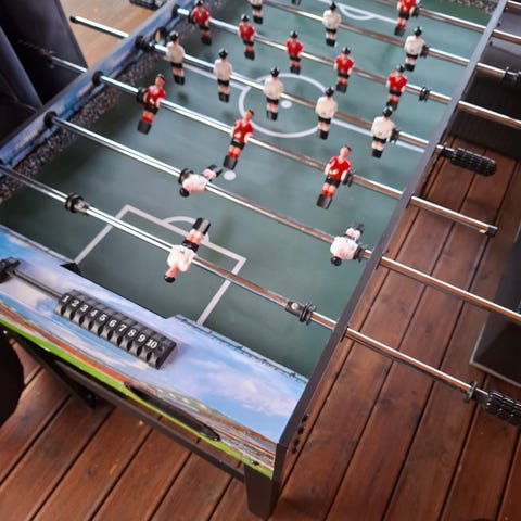 Fotballspill med grønn spilleflate, svart ramme og svarte ben. Utstyrt med metallstenger og spillfigurer i rødt og hvitt, og med to baller. Passer for innendørs bruk og perfekt til barnerommet.