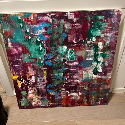To originale håndmalte kunstverk på lerret med unike motiver. Hvert lerret har en blå bakgrunn med fargerike figurer malt i grønt, rosa og andre farger. Passer til dekorasjon og samling.