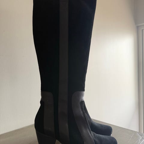 Bianco støvletter i sort imitert skinn, størrelse 37, ca 10 cm høy hæl. Glidelås på innsiden for enkel på- og avkledning.