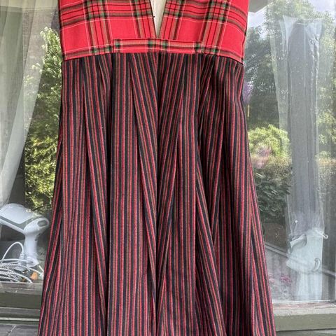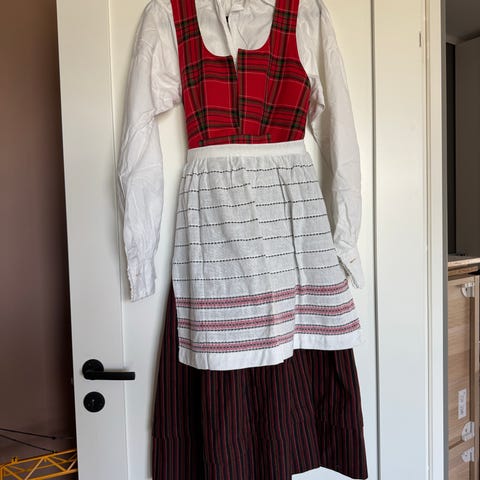 Skjørtet kan legges ned, og vesten har gode sømmingsmonn. Skjorten har en liten skade på nuperellen på venstre mansjett. Pent forkle følger meg.
