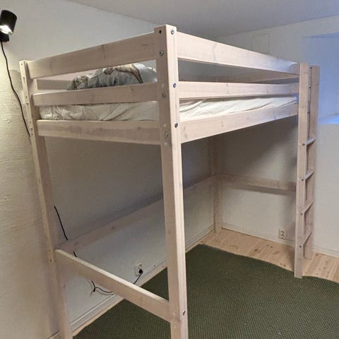 Kul loftseng i heltre furu med sklie, tårn, tunnell og sjørøvertrekk. Medfølger helt ny madrass.