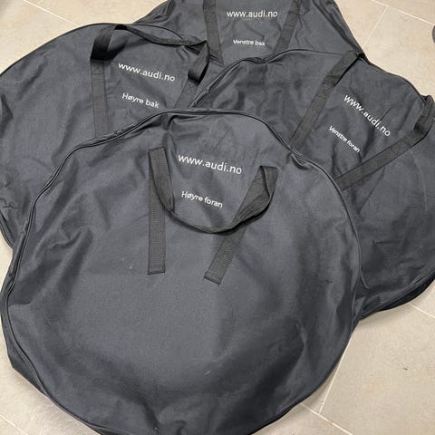 Selger et komplett sett med 4 hjulposer til Audihjul. Store justeringsmuligheter. De er bruk til lagring av hjul innendørs i ca 9 mnd. De er uten slitasjemerker. Selv om man vasker hjulene så er de alltid litt skitne. Noen merker må derfor påregnes. Et ypperlig valg om man ønsker å ta litt ekstra godt vare på hjulene sine. Nypris er ca 800 kr hos Møller.
