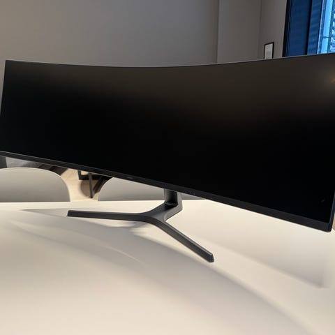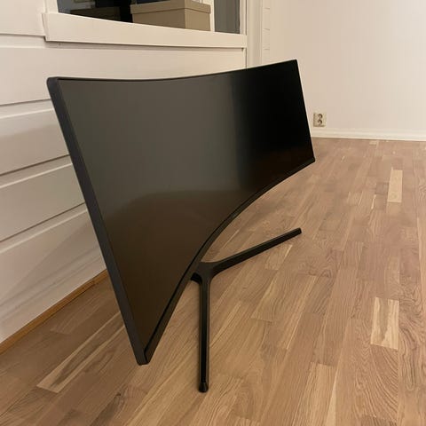 Samsung 49 tommer buet skjerm med integrert stativ. Skjermen har en buet design som gir en bredere synsvinkel og forbedret visningsopplevelse. Passer for bruk i hjemmet eller på kontoret.