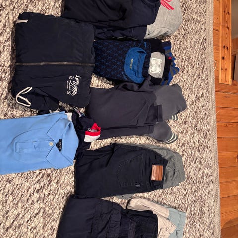 1 Nike hettegenser, 2 Nike t-skjorter, 1 fleecejakke fra pompdelux, 2 skjorter, 2 joggedresser, en Nike joggebukse, 6 trenings-shortser, 5 trenings t-skjorter, 2 luer, et par hansker, en pen cardigan fra pompdelux og en genser fra HM.